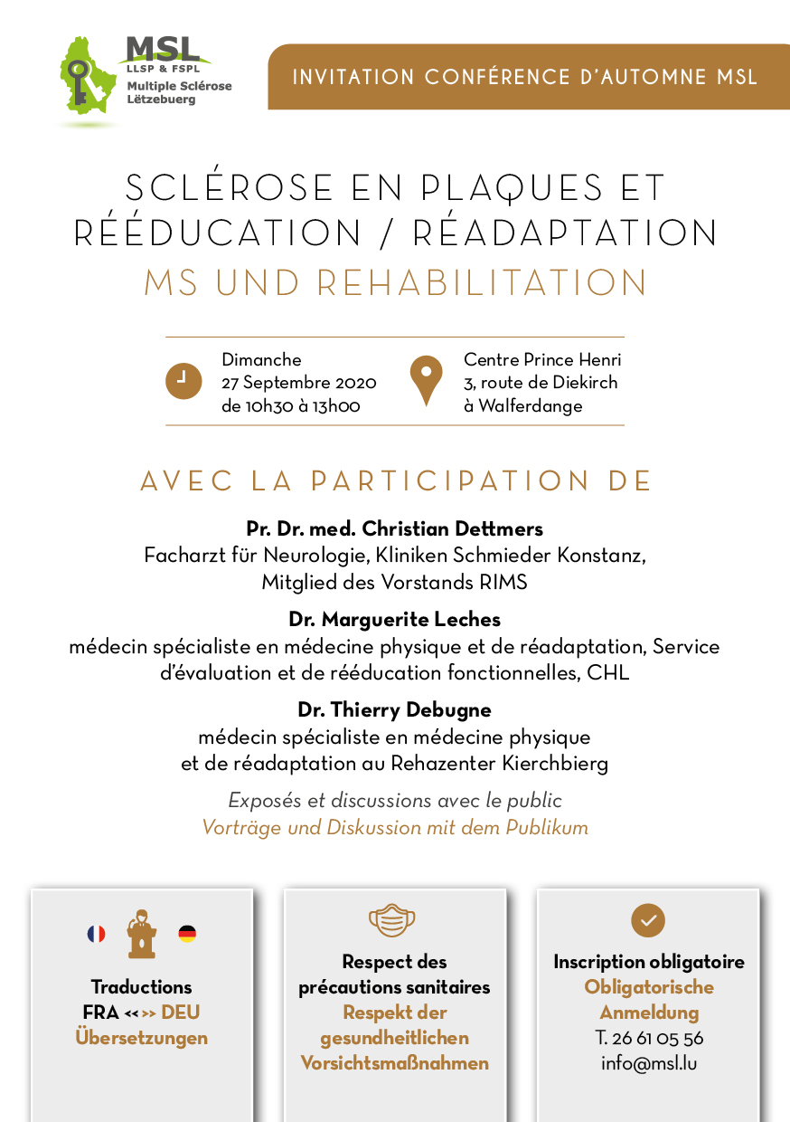 Sport-Santé bei neurologesche Krankheeten : https://youtu.be/9opn7Imyz-k sur Youtube ou https://www.facebook.com/sportsante.lu/videos/261379091182076/ sur Facebook